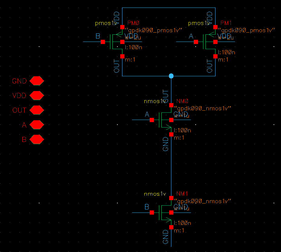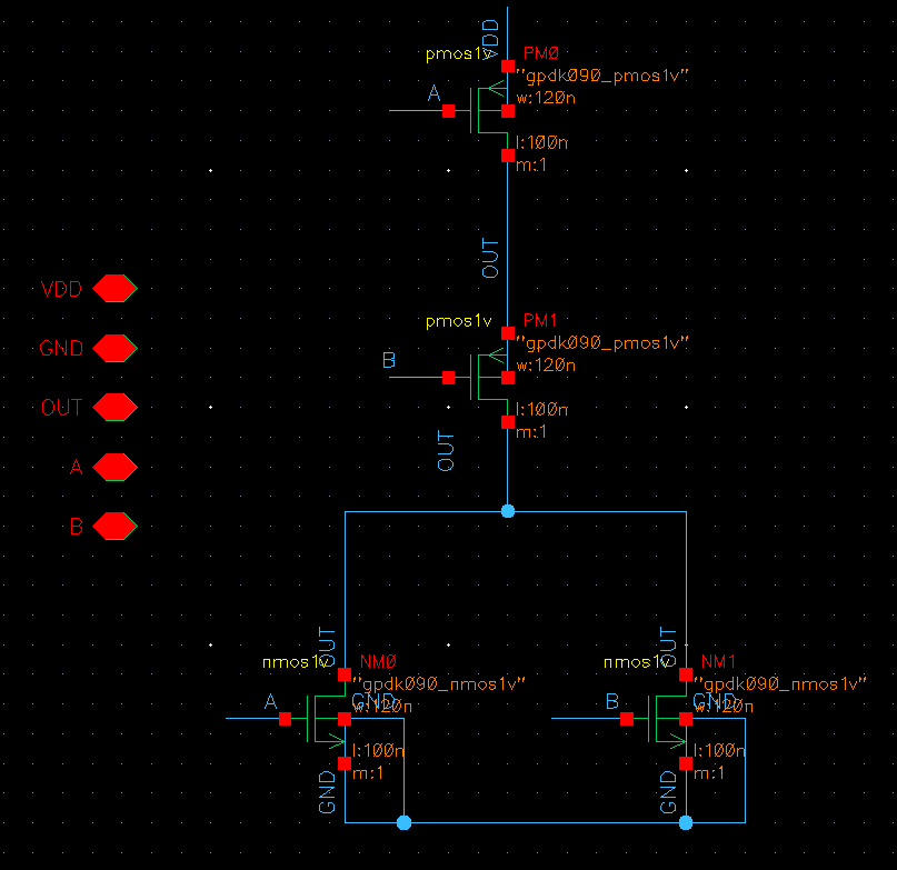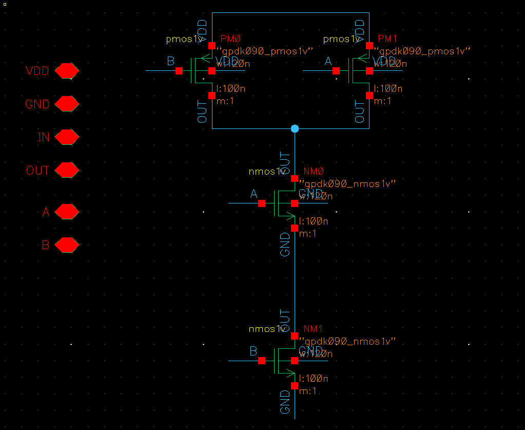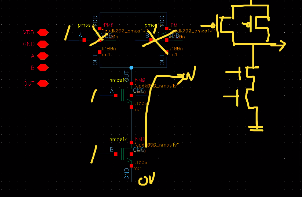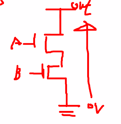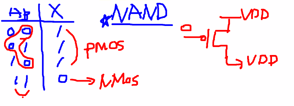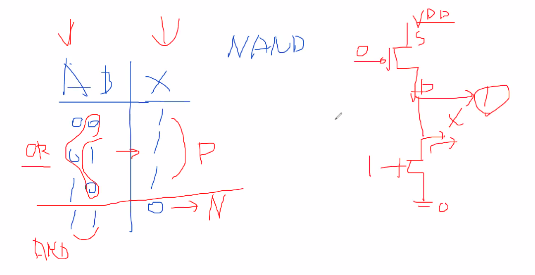 NAND 게이트 : 입력이 하나라도 0이되면 1이 출력 -> PMOS의 특성 또한 G에 0이 들어와야 1이 출력된다.