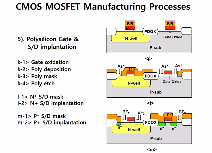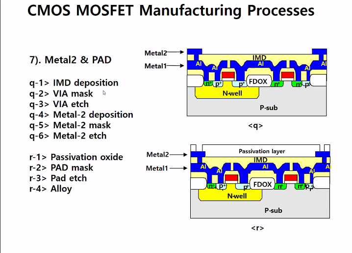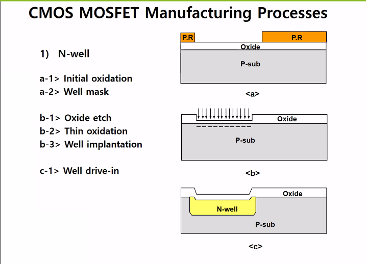 N MOS는 P기판위에서 제작할 수 있고, P MOS는 N기판 위에서 제작할 수 있다. 위의 구조를 보고 제작을 한다.