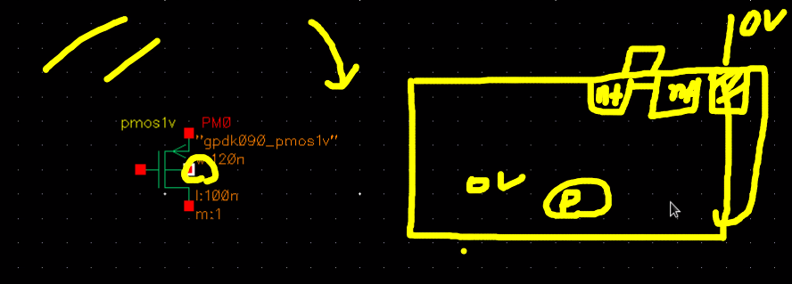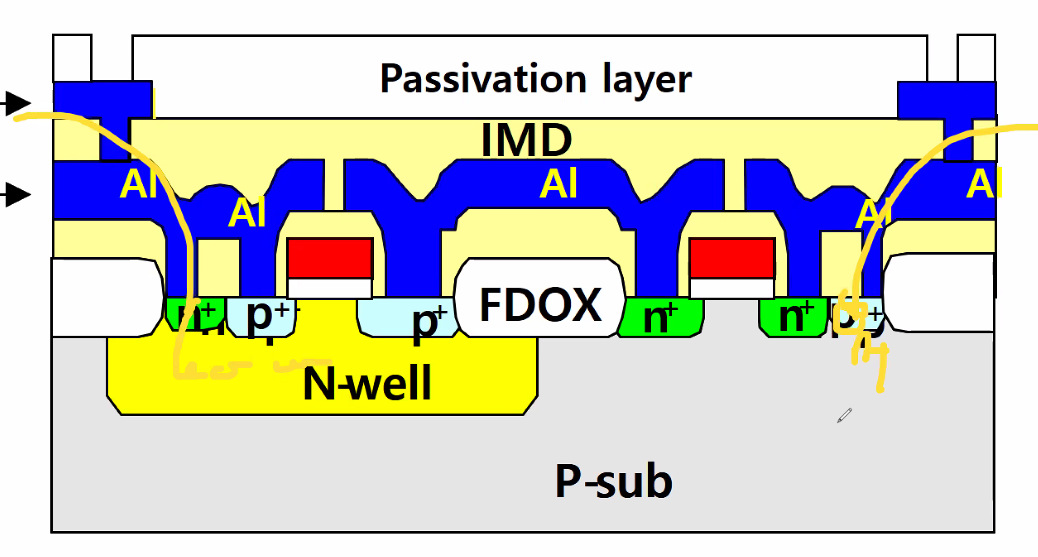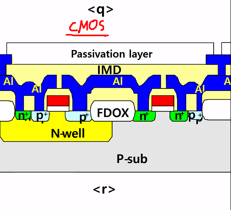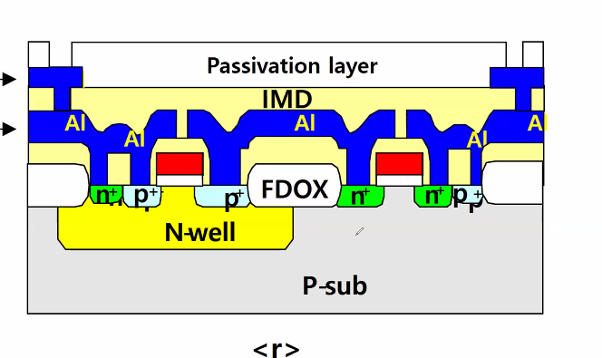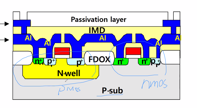 위의 n+, p+는 인플런트. 정공을 전해줄 수 있는지, 전자를 전해줄 수 있는지 나타내는 것. 위의 n+와 p+는 wire와 같은 역할이다. -> 공정상 N-well은 전자이기 때문에 n+는 전자를 공급하고 p+는 전자를 빼내어 P-sub을 만들어낸다.